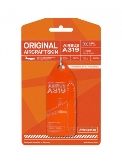 Cet échantillon de peau de l’avion est livré sur une plaque de carton épais sur laquelle figure le type d’appareil (Airbus A319), son immatriculation (G-EZII) et son numéro de série (MSN 2471), le nombre d’exemplaires de porte-clés produits (3 500) et les dates de premier (2005) et dernier vol (2020) de l’avion.
