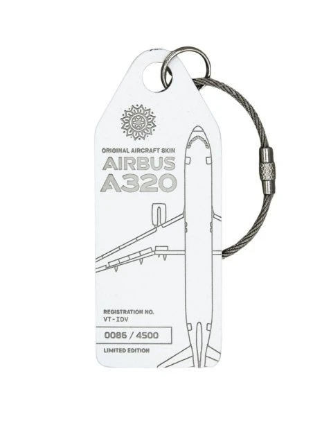 Un porte-clés AviationTag fabriqué à partir du fuselage d’un Airbus A320 immatriculé VT-IDV de la compagnie aérienne indienne IndiGo.
