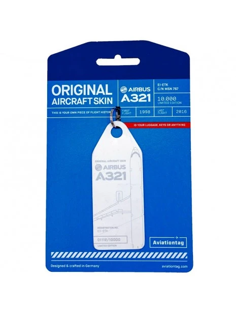 Cet échantillon de peau de l’avion est livré sur une plaque de carton épais sur laquelle figure le type d’appareil (Airbus A321), son immatriculation (EI-ETK) et son numéro de série (C/N MSN 787), le nombre d’exemplaires de porte-clés produits (10000) et les dates de premiers (1998) et derniers vols (2016) de l’avion.