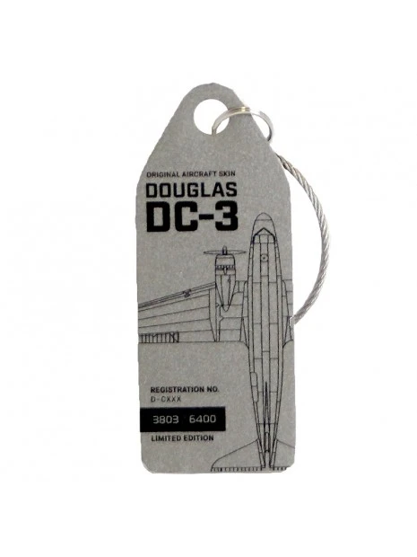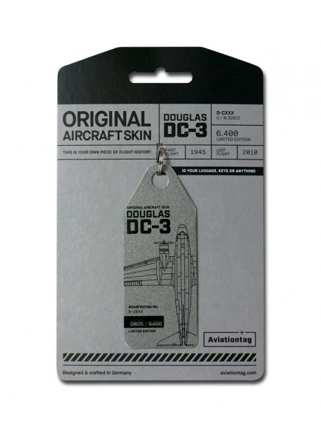 Cet échantillon de « peau de l’avion » (« Original aircraft skin ») est livré sur une plaque de carton épais sur laquelle figure le type d’appareil (Douglas DC3), son immatriculation (D-CXXX) et son numéro de série (C/N 32872), le nombre d’exemplaires de porte-clés produits (6 400) et les années de ses premiers (1945) et derniers vols (2010).