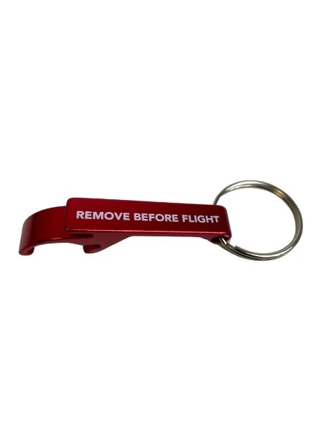 Affirmez votre passion pour l’aviation avec ce porte-clés décapsuleur au marquage « remove before flight ».