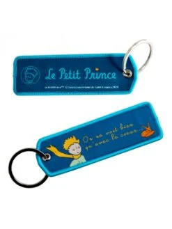Porte-clés flamme vintage, tissé, avec citation du Petit Prince de SAINT EXUPÉRY : « On ne voit bien qu’avec le cœur… ».