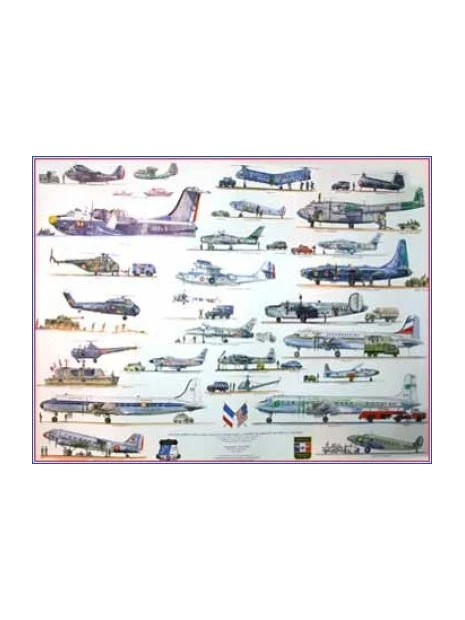 Ce poster représente des avions américains aux couleurs françaises, datant de la guerre d’Indochine. C’est une reproduction de dessins aquarellés de Jean Bellis.