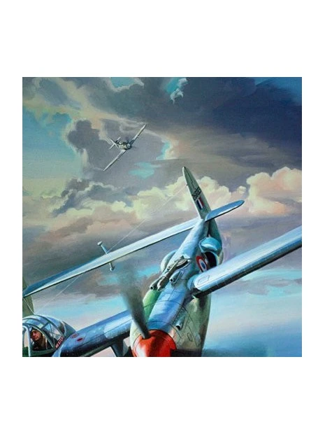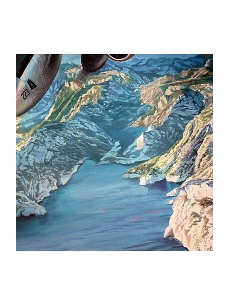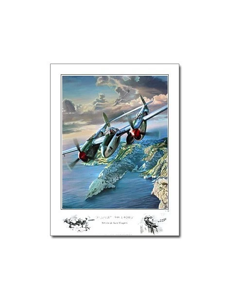 Le 31 juillet 1944, Antoine de SAINT-EXUPERY décolle pour sa dernière mission. Sur son P38 F5 de reconnaissance, il part vers les côtes de France, et disparait sans laisser de traces… Jusqu’en 1998 où un pêcheur repêche une concrétion calcaire ou est emprisonné un bijou : une gourmette avec le nom de l’aviateur : Antoine de SAINT-EXUPERY. Dès lors, des recherches d’abord infructeuses vont finalement déboucher sur la mise à jour des débris de l’avion : peu de choses en fait, dont le train d’attérissage, et pas d’indices quand à la cause de la mort de SAINT-EXUPERY. Un pilote allemand, Horst RIPPERT témoigne alors après un long silence qu’il a abattu le célèbre pilote-écrivain 63 ans plus tôt. Témoignage sincère ? affabulation ? Il n’y a aucune preuve qui apporte la moindre certitude. Je suis néanmoins parti sur cette cette piste pour raconter la disparition de SAINT-EXUPERY à travers un tableau dont l’action se situe au-dessus d’un lieu bien connu : « les Calanques ». SAINT-EXUPERY, rêveur survole ce beau paysage et ne voit pas le petit chasseur allemand se positionner derrière lui… dans une minute, SAINT-EXUPERY va définitivement quitter la « Terre des Hommes ».