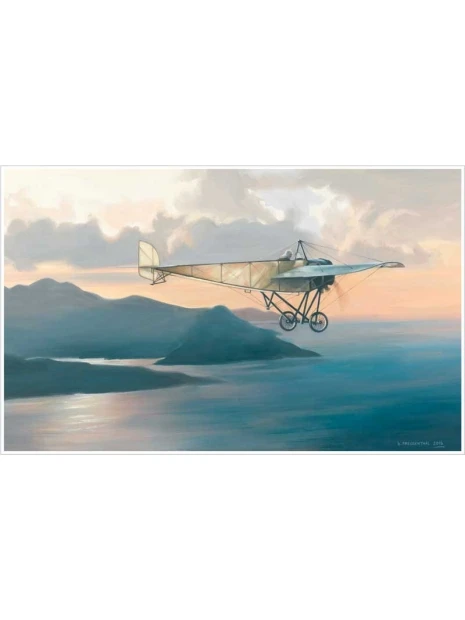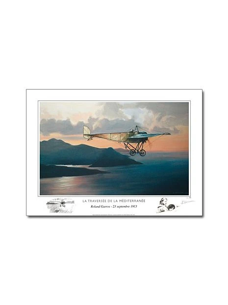 Le 23 septembre 1913, Roland GARROS réalise un exploit historique en traversant la Méditerranée à bord de son petit Morane Saulnier. Après avoir décollé à l’aube de Frégus, il perd une pièce de son moteur au large de la Corse (en arrière plan sur cette image). Il atterrit à Bizerte après presque 8 heures de vol avec seulement 5 litres de carburant dans son réservoir !