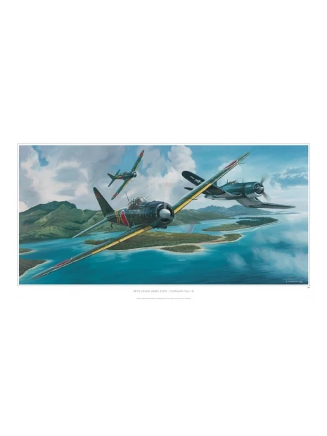 Ce poster au format « kakemono » représente trois Mitsubishi Zéro en vol, avec un portrait du pilote japonais Saburo Sakaï.