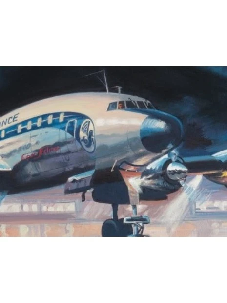 Dernier-né de la légendaire famille des Constellation, le Starliner incarne le raffinement des années 1950, une époque où voyager en avion était un luxe inégalé. Alors que le Boeing 707 dominait déjà les cieux, cet avion emblématique vivait ses derniers instants de gloire, capturés ici avec une atmosphère empreinte de nostalgie.