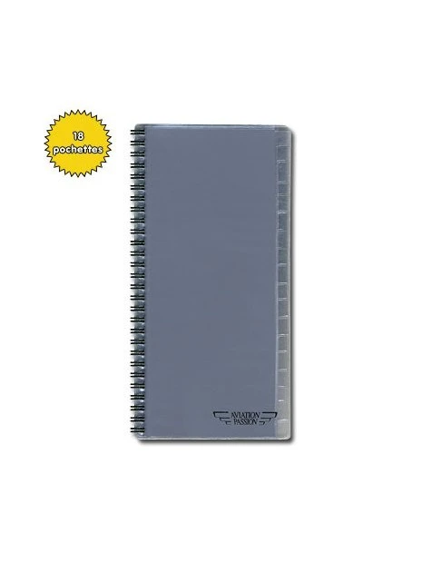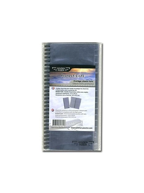 Un carnet de 18 pochettes reliées, au format 12.5 x 24 cm, avec couverture transparente souple, pour protéger vos check-lists.