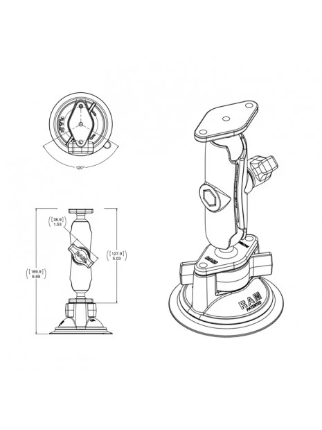 Le RAM-B-166U se compose d’une base à ventouse de 3,3 pouces de diamètre, d’un bras à double douille de longueur standard et d’un adaptateur de base en diamant. La base à ventouse est conçue pour avoir une forte adhérence sur les surfaces en verre et en plastique non poreux, y compris RAM disques adhésifs. Le support est conçu avec un système de rotule et de douille en caoutchouc breveté RAM de 1 « de diamètre qui a des points de réglage aux deux extrémités du bras à double douille; cela permet un réglage presque infini et des angles de vision parfaits. Le modèle de trou trouvé sur l’adaptateur de base en diamant se connectera à la plupart des berceaux de RAM.
