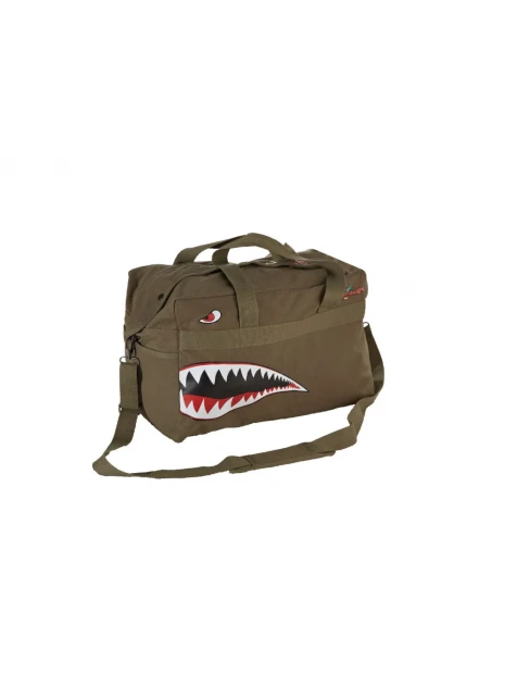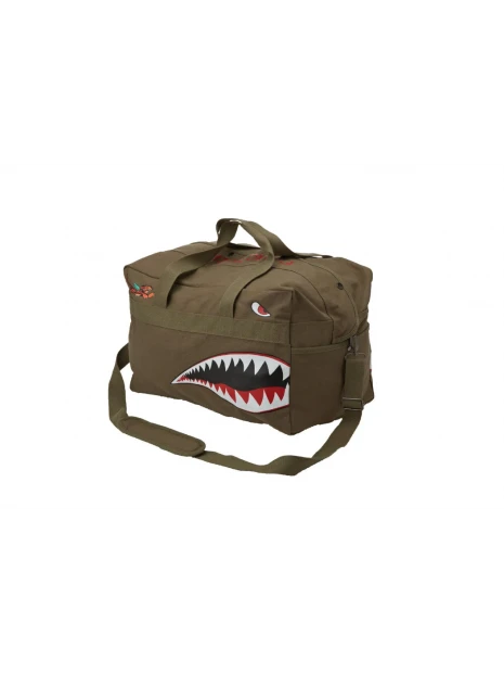 Les emblématiques « dents de requin » et le motif d’un Flying Tiger en plein saut sont sérigraphiés sur les deux côtés, tandis que le rabat central arbore l’inscription « Flying Tigers« . Confectionné en toile de coton robuste de couleur olive, ce sac dispose de deux poches latérales avec fermetures à boutons en cuivre et est équipé d’une bandoulière ajustable pour un confort optimal.