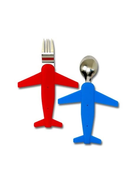 Les formes arrondies et plates de ces couverts ne blesseront pas votre enfant. Ils ont un manche en plastique bleu et rouge.