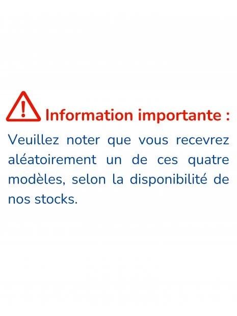 Veuillez noter que vous recevrez aléatoirement un de ces quatre modèles (voir sur le visuel du produit), selon la disponibilité de nos stocks.
