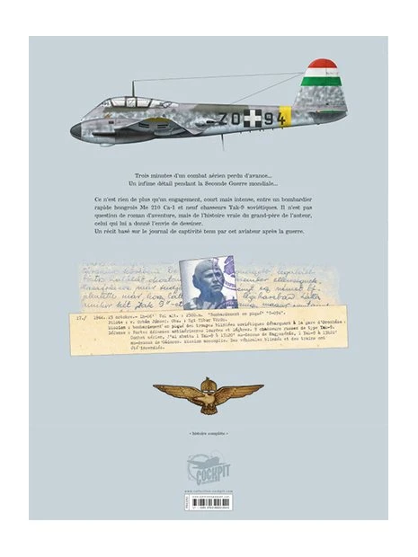 Trois minutes d’un combat aérien perdu d’avance… Un infime détail pendant la seconde guerre mondiale… Ce n’est rien de plus qu’un engagement, court mais intensif, entre un bombardier rapide hongrois Me 210 Ca-1 et neuf chasseurs Yak-9 soviétiques. Il n’est pas question de roman d’aventure, mais de l’histoire vraie du grand-père de l’auteur, celui qui lui a donné l’envie de dessiner.